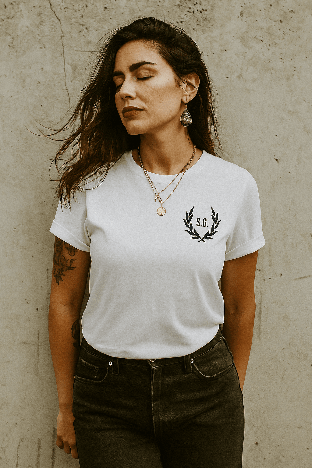 Esta camiseta blanca personalizable con escudo de laurel rinde homenaje a la fuerza interior y a los logros que marcan tu camino. “Escudo de Logros” representa protección, historia y orgullo silencioso. En el pecho, una corona de laurel en forma de escudo, estampada a mano en vinilo negro de alta calidad, se convierte en símbolo de tus victorias. Además, puedes personalizarla con tus iniciales o una fecha especial, haciendo que cada pieza sea única. Cada prenda se estampa a mano, una a una, fiel al alma artesanal de TORMENTA.