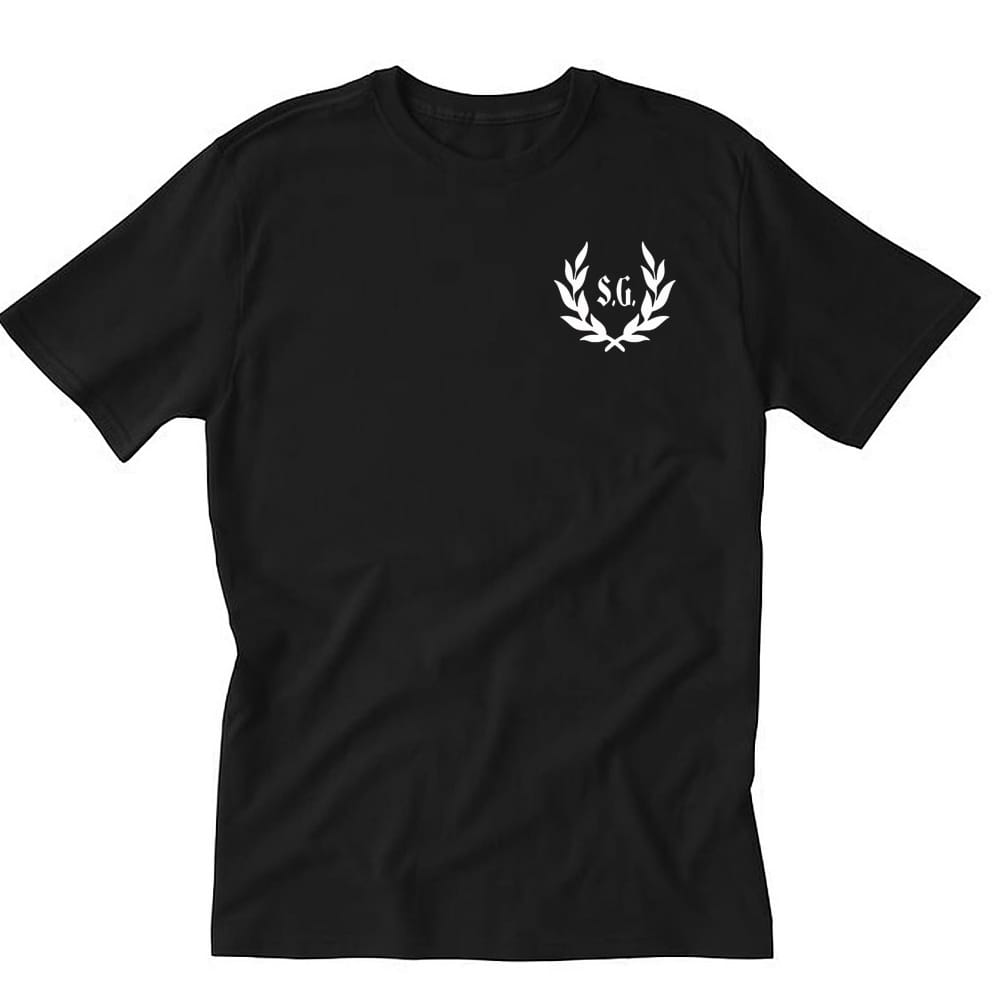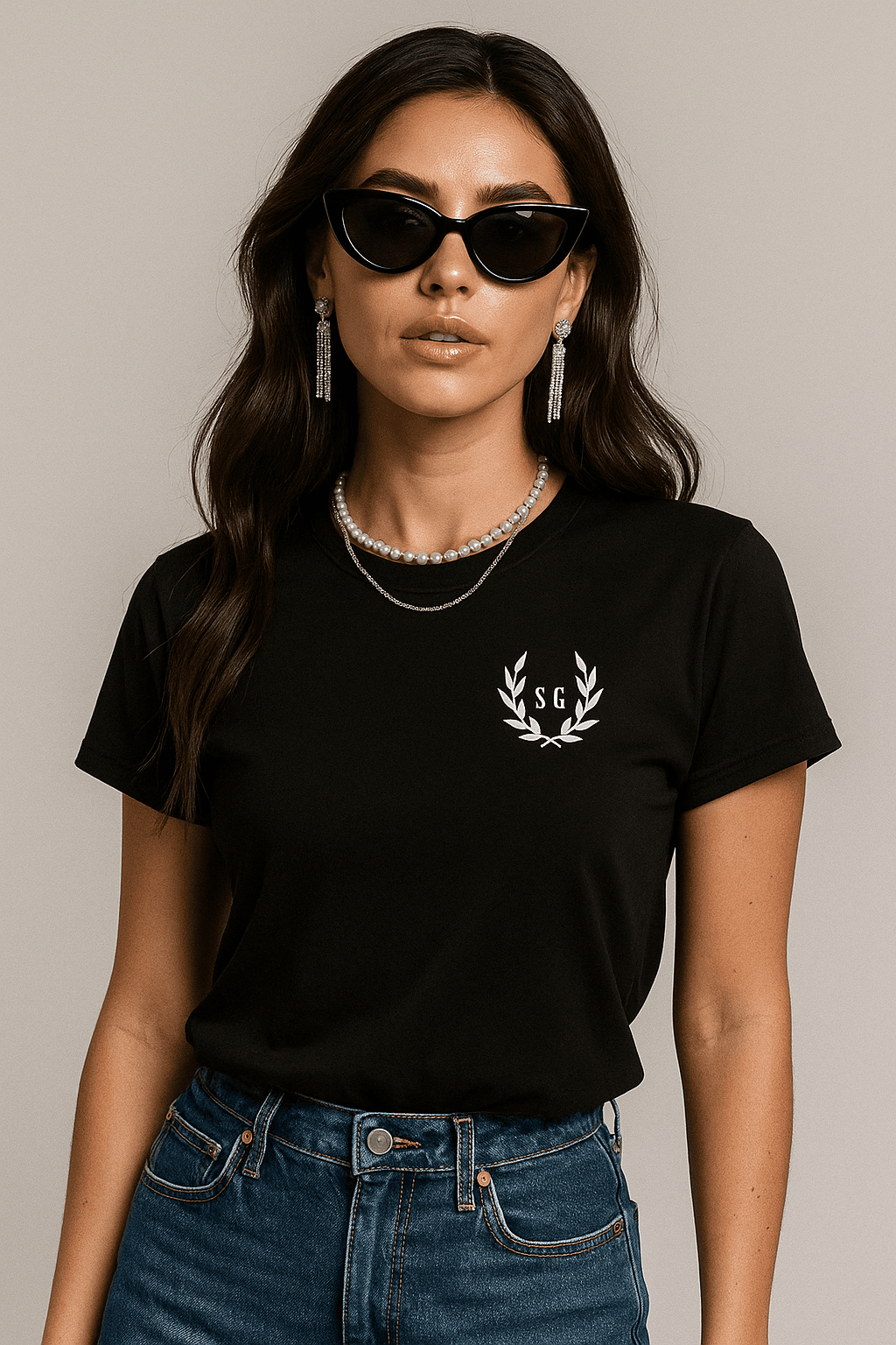 Camiseta negra con corona blanca sobre el pecho, personalizable con tus iniciales. Unisex, estampada a mano y edición limitada. Lleva tu historia como corona.
