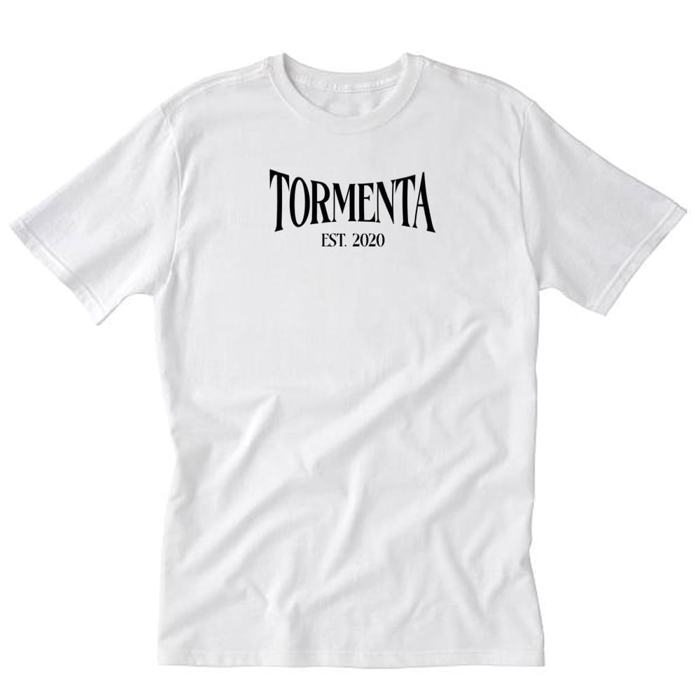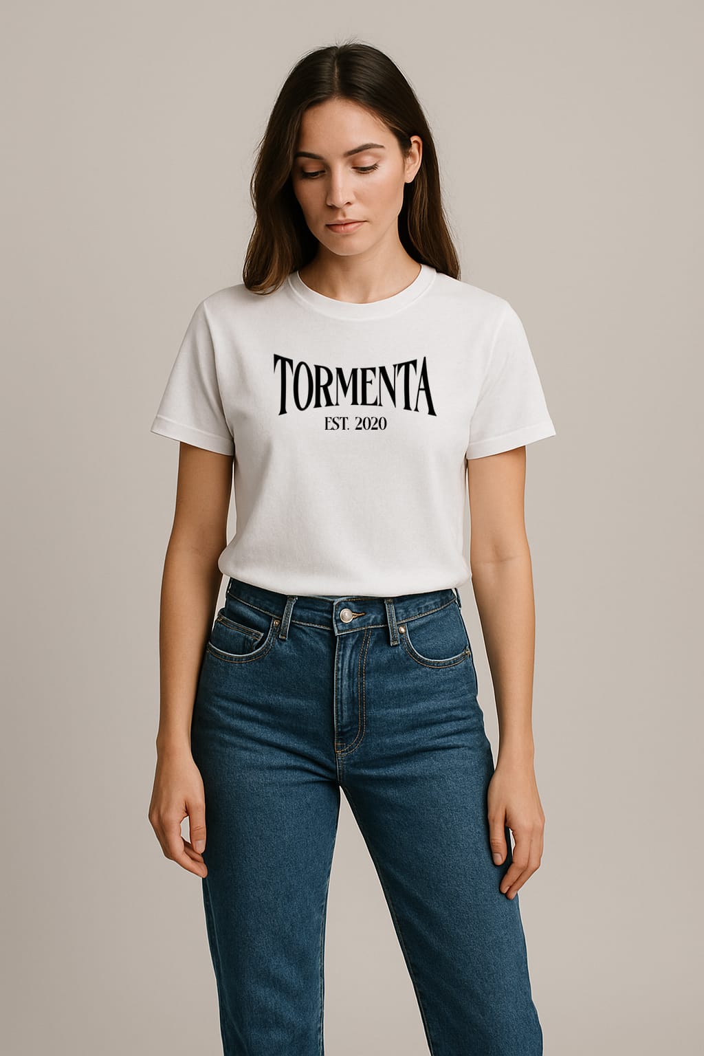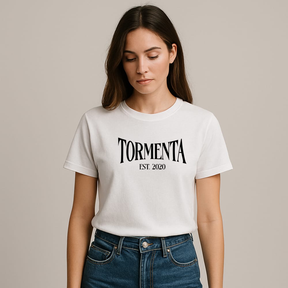 Camiseta vinilo artesanal TORMENTA EST 2020. Exclusiva, única y estilo old school. Vinilo negro sobre blanco, lista para destacar con actitud.